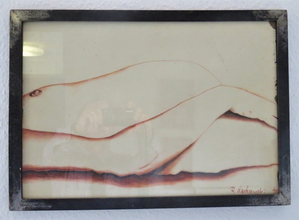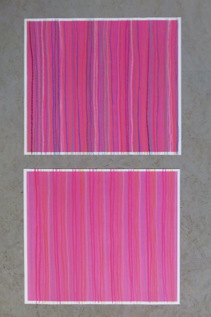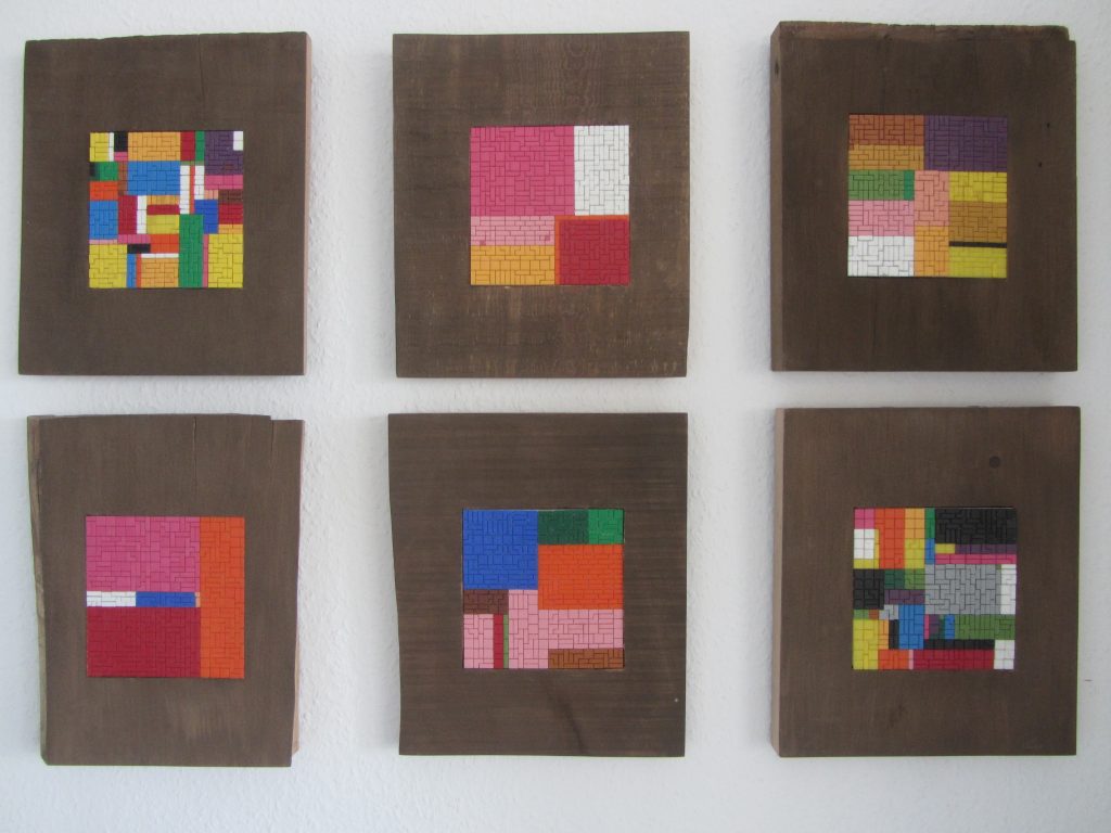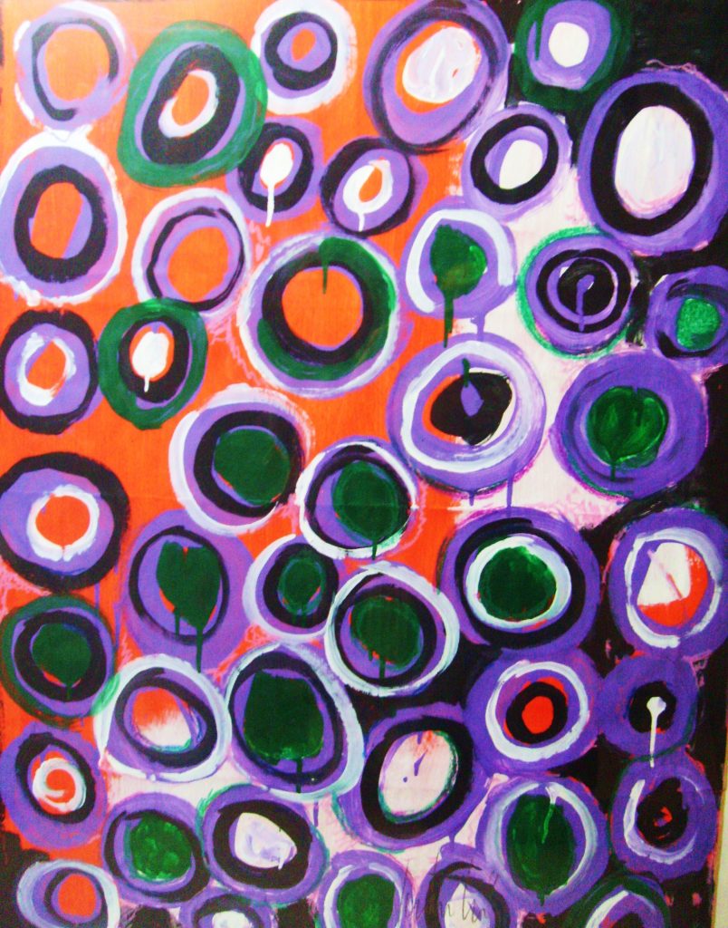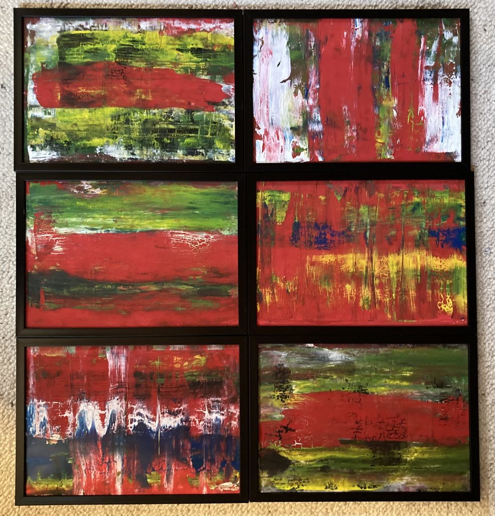 „Gelbfeld“ – Lack auf Papier„Spachtel 3 – Acryl auf Papier„Spachtel 2“ – Acryl auf Papier„Kreise“ – Acryl auf Papier„Via Bartelli“ – Seidenpapier, Acryl auf Altpapier„Spachtel 1“ – Acryl auf Papier„Rotfeld 2“ – Lack auf Papier„lila Würfel“ – Seidenpapier, Lack auf Altpapier„rote Würfel“ – Seidenpaier, Lack auf Altpapier„Beatles“ – Tusche auf Papier„Twiggy“ – Acryl auf Papier„Kettenreaktion“ – Acryl auf Hartfaser„Schwanger“ – Rötel auf Papier„Wirbel“ – Öl auf Papier „Kois 2“ – Öl auf Leinwand
