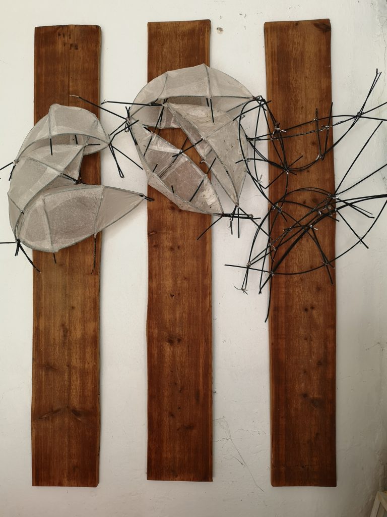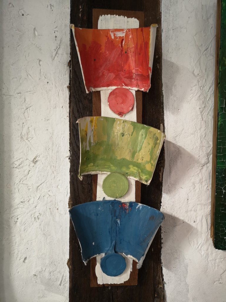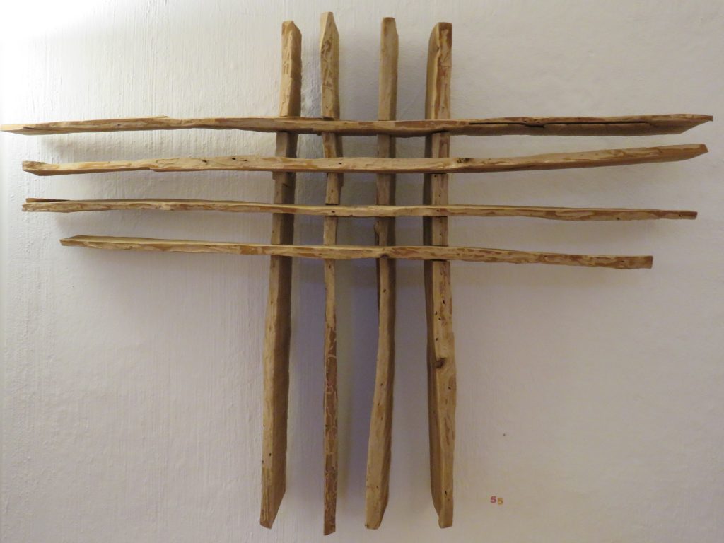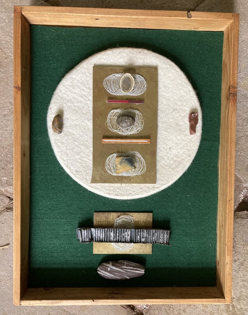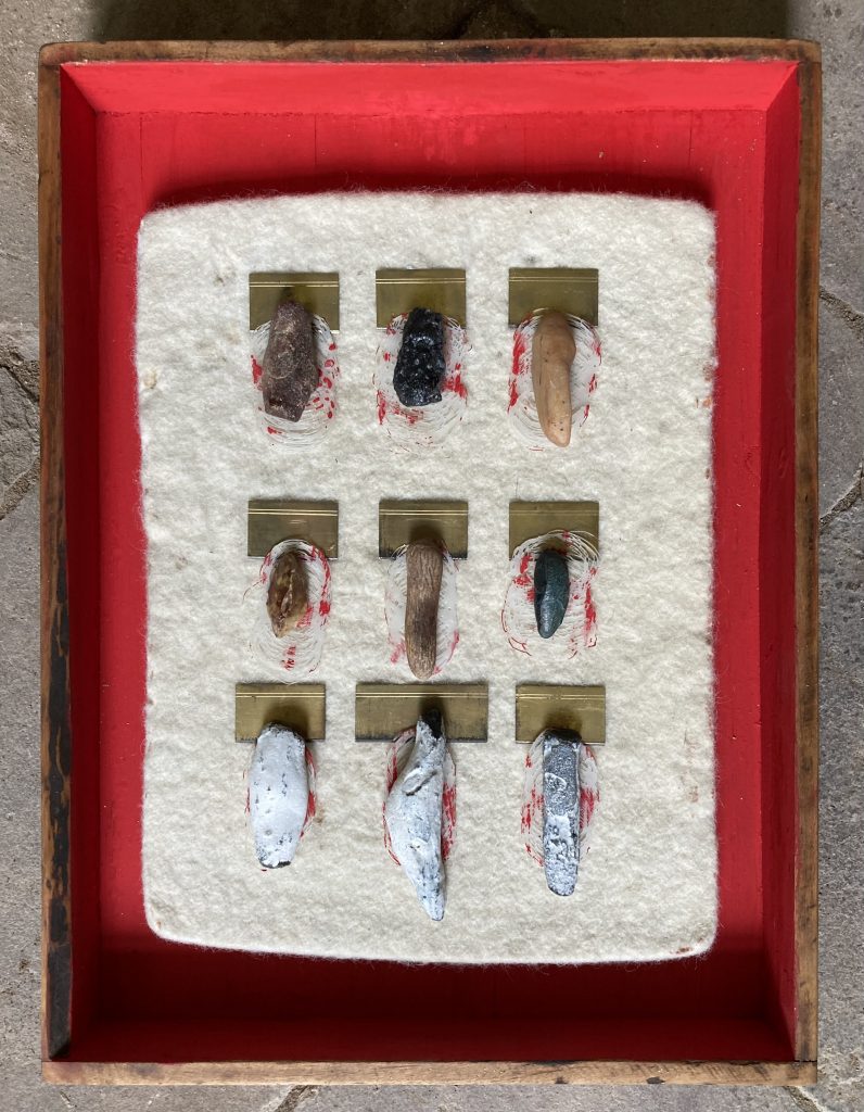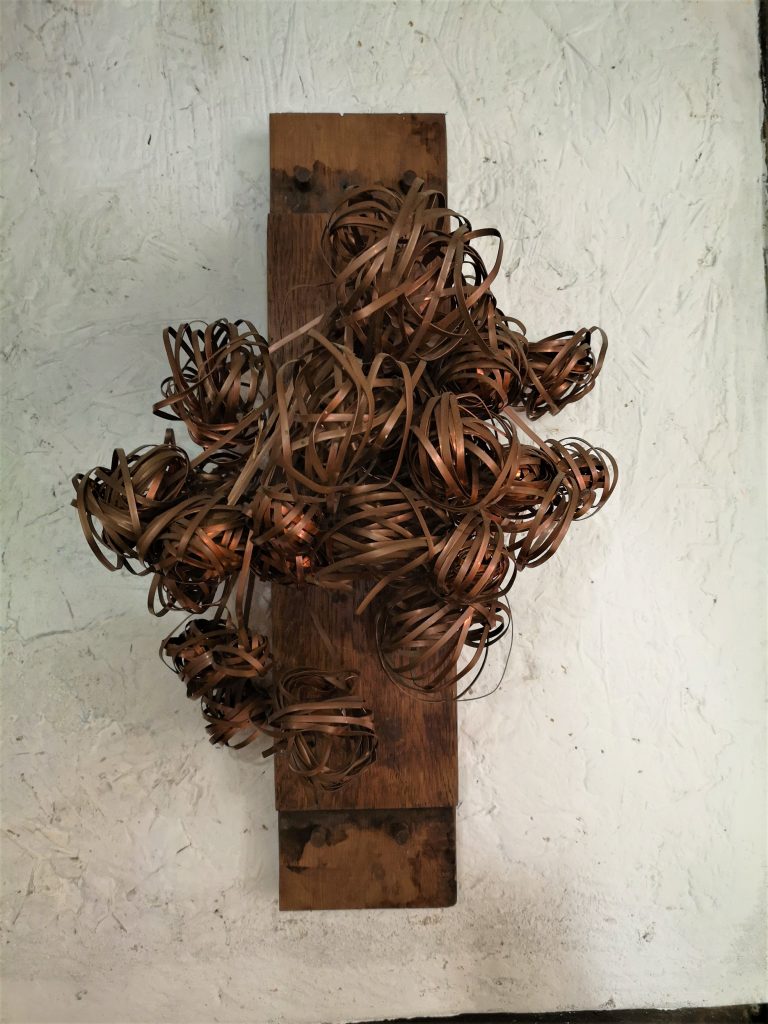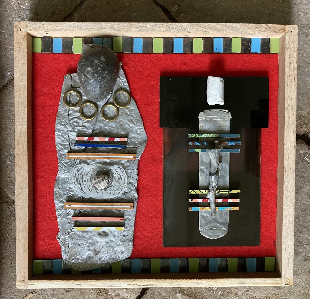 „Baumschnitt 1“ – Obstbaum, Lack„Baumschnitt 2“ – Obstbaum„Baumschnitt 3“ – Obstbaum auf Aluplatte„Diasammlung“ – Dias, Schweißdrahl, Alu auf Eichenbrett„Gurkensalat“ – Filz, Emailletopf„Babe“ – Furnierholz„Steine 1“ – versch. Materialien im Holzkasten„Herrmann Eisenberg“ – versch. Materialien im Holzkasten„Steine 2“ – versch. Materialien im Holzkasten„Koi 4“ – geknüpfte Seide ca. 26×70 cm, 2022geknüpfte Seide ca. 26×26 cm, 2022geknüpfte Seide ca.100×170 cm, 1985geknüpfte Seide ca. 26×26 cm, 2022geknüpfte Seide ca. 26×26 cm, 2022geknüpfte Seide ca. 26×26 cm, 2022„Donnerkeilregen“ – Belemniten, Kupferdraht, Klemmkeile, Eichenbalken„Donnerkeilturm“ – Belemniten„Hornstamm“ – Geweih auf Akazienstamm„Fundturm“ – archäologische Fundstücke, Garn„Kettenkugel“ – 2019 „Zaumzeug“ – Leder auf Eichenbohle, „Skyline“ – Drehbankstähle auf Eichenbohle„Kugelbrett“ – Porzellanmahlkugeln, Lack, Holzbohle„Verbindung“ – Kupfer, Eiche„Knoppfsäule“ – Knöpfe, Schweißdraht, Eiche„“Glasbruch“ – Glas auf Kiefer„Tal der Könige 1“ – versch. Materialien im Holzkasten„Tal der Könige 2“ – versch. Materialien im Holzkasten„Tal der Könige 3“ – Tierschädel, Seide im Holzkasten„Flechtwerk 1“ – Papier auf Buchenbohle„Flechtwerk 2“ – Papier auf Buchenbohle„Hülle 1“ – Seidenpapier, Peddigrohr auf Eichenbohle (3-teilig)„Hülle 2“ – Seidenpapier, Peddigrohr auf Buchenbohle„Wicklung“ – Kupfer auf Eichenbohle„Wollbesen“ – Wolle, Schneebesen auf Eichenbohle„Stahldruck“ – Stahldruckproben auf Eichenbohle„Flucht“ – Schädel, Bleischiffchen„Seeufer“ – Muscheln, Sackleinen, Holzstäbe„Schnittwerk 1“ – Messing, Eiche„Skyline“ – Messing, Eichenbalken„Cornetto“ – Gips, Alu, Wurzelholz auf Eichenplatte„Waldgang“ – Tierschädel, Lack, Filz im Holzkasten„Strein im Kasten“ – Stein, Silberdraht, Eichenbrett, Filz, Holzkasten„hängender Stein“ – Feuersteinknolle im Eichenbalken, 2019„Farbspiel“ – Mosaikkunststoff auf Buchenbohle (6-teilig)„geschlossene Kirche“„Hammerdenkmal“„Drahtfund“ „Glasbruch“ – Glas auf Eichenbohle„Steinseide“ – Seide, Sandstein„Seidenstück“„Steinseide grün und gelb“ – Seide, Sandstein„Macchia“„Autowerkstatt“ – Lochkarten, Kupferdraht, Stahlrahmen„Hühnerstein“ – Lochsteine auf Eichenbohle„Zwiegespräch“ 2023 – Zahnprothesen, Pappmache, Lack`“Zündholz“ – Holz, Lack auf Alublech„Fische“ 2022 – ca. 26×26 cm geknüpfte Seide