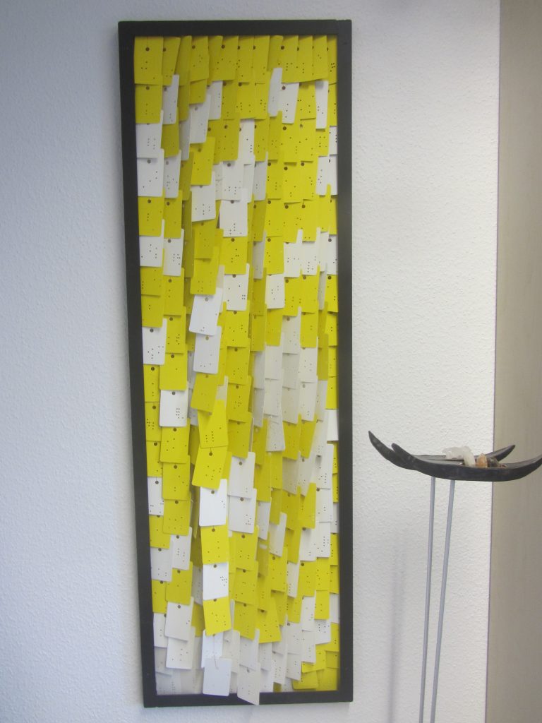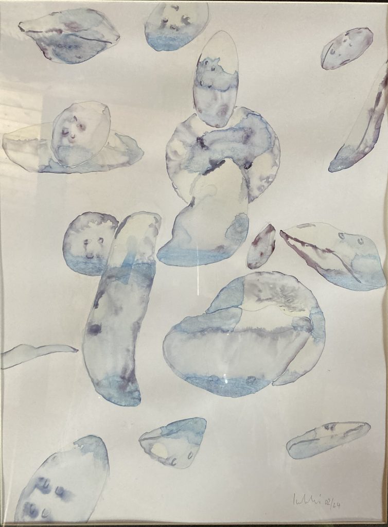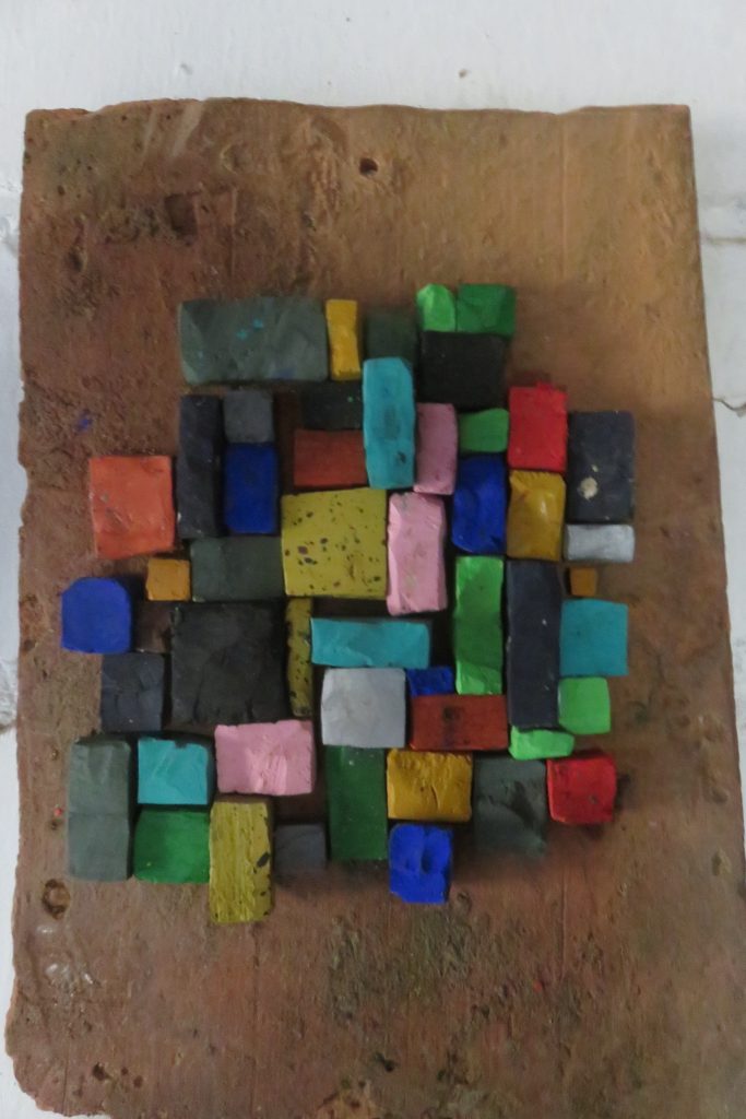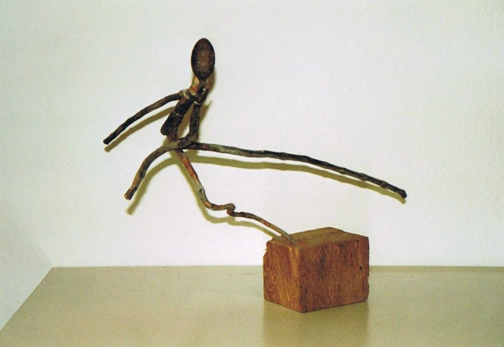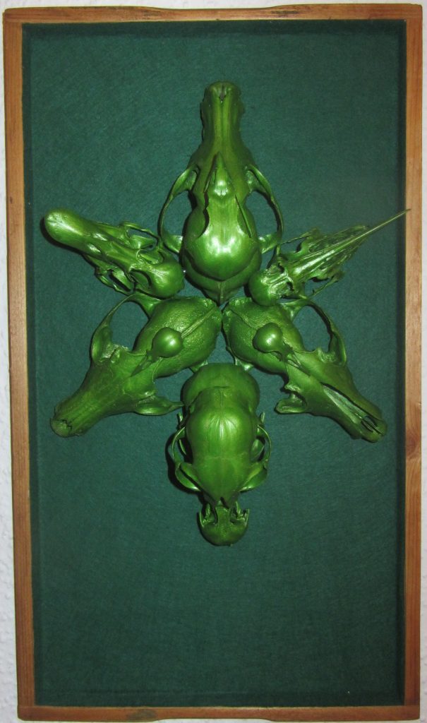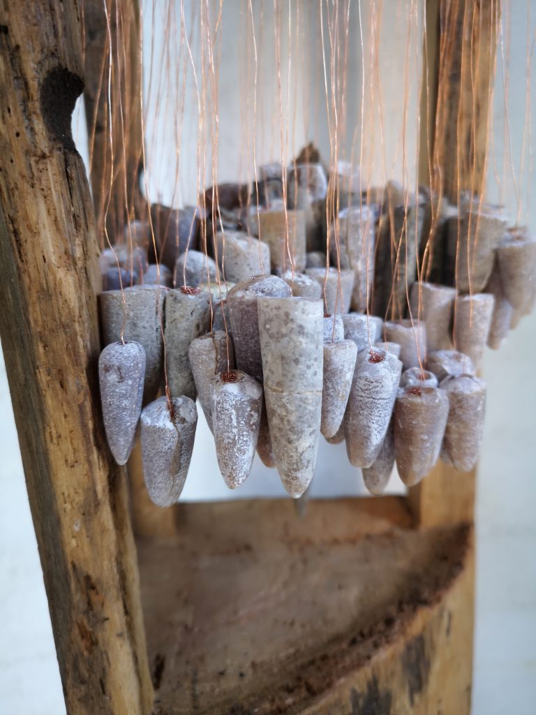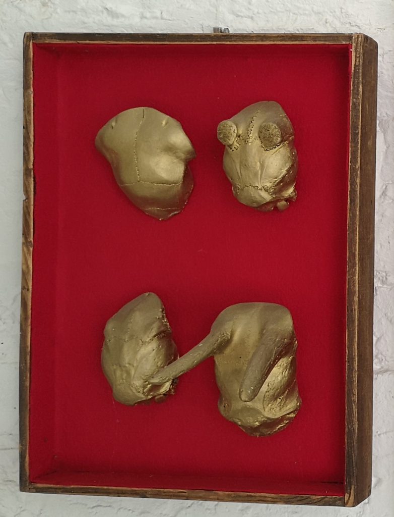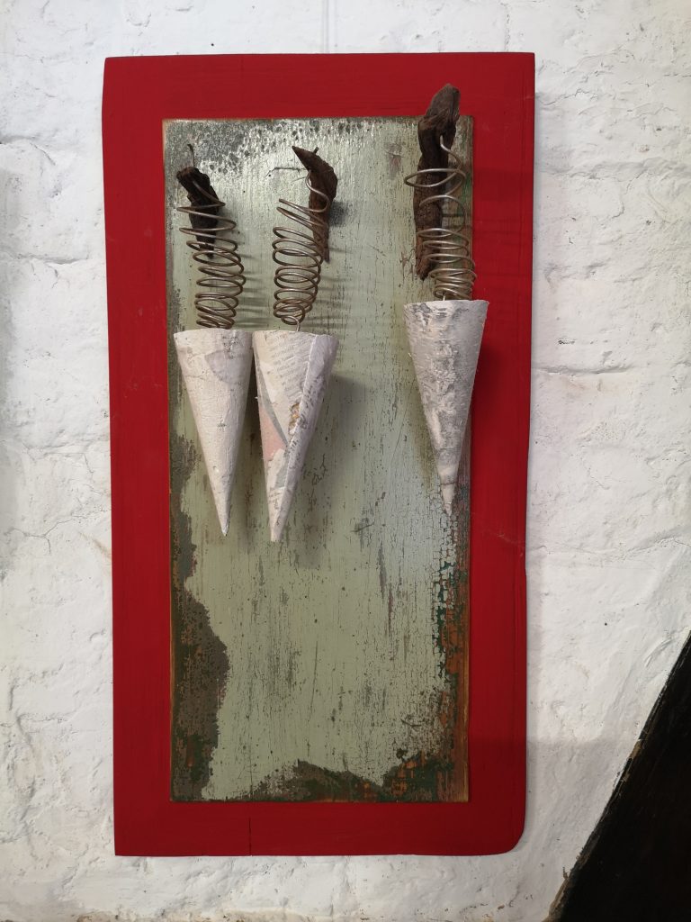 „Baumschnitt 1“ – Obstbaum, Lack„Baumschnitt 2“ – Obstbaum„Baumschnitt 3“ – Obstbaum auf Aluplatte„Diasammlung“ – Dias, Schweißdrahl, Alu auf Eichenbrett„Gurkensalat“ – Filz, Emailletopf„Babe“ – Furnierholz„Steine 1“ – versch. Materialien im Holzkasten„Herrmann Eisenberg“ – versch. Materialien im Holzkasten„Steine 2“ – versch. Materialien im Holzkasten„Koi 4“ – geknüpfte Seide ca. 26×70 cm, 2022geknüpfte Seide ca. 26×26 cm, 2022geknüpfte Seide ca.100×170 cm, 1985geknüpfte Seide ca. 26×26 cm, 2022geknüpfte Seide ca. 26×26 cm, 2022geknüpfte Seide ca. 26×26 cm, 2022„Donnerkeilregen“ – Belemniten, Kupferdraht, Klemmkeile, Eichenbalken„Donnerkeilturm“ – Belemniten„Hornstamm“ – Geweih auf Akazienstamm„Fundturm“ – archäologische Fundstücke, Garn„Kettenkugel“ – 2019 „Zaumzeug“ – Leder auf Eichenbohle, „Skyline“ – Drehbankstähle auf Eichenbohle„Kugelbrett“ – Porzellanmahlkugeln, Lack, Holzbohle„Verbindung“ – Kupfer, Eiche„Knoppfsäule“ – Knöpfe, Schweißdraht, Eiche„“Glasbruch“ – Glas auf Kiefer„Tal der Könige 1“ – versch. Materialien im Holzkasten„Tal der Könige 2“ – versch. Materialien im Holzkasten„Tal der Könige 3“ – Tierschädel, Seide im Holzkasten„Flechtwerk 1“ – Papier auf Buchenbohle„Flechtwerk 2“ – Papier auf Buchenbohle„Hülle 1“ – Seidenpapier, Peddigrohr auf Eichenbohle (3-teilig)„Hülle 2“ – Seidenpapier, Peddigrohr auf Buchenbohle„Wicklung“ – Kupfer auf Eichenbohle„Wollbesen“ – Wolle, Schneebesen auf Eichenbohle„Stahldruck“ – Stahldruckproben auf Eichenbohle„Flucht“ – Schädel, Bleischiffchen„Seeufer“ – Muscheln, Sackleinen, Holzstäbe„Schnittwerk 1“ – Messing, Eiche„Skyline“ – Messing, Eichenbalken„Cornetto“ – Gips, Alu, Wurzelholz auf Eichenplatte„Waldgang“ – Tierschädel, Lack, Filz im Holzkasten„Strein im Kasten“ – Stein, Silberdraht, Eichenbrett, Filz, Holzkasten„hängender Stein“ – Feuersteinknolle im Eichenbalken, 2019„Farbspiel“ – Mosaikkunststoff auf Buchenbohle (6-teilig)„geschlossene Kirche“„Hammerdenkmal“„Drahtfund“ „Glasbruch“ – Glas auf Eichenbohle„Steinseide“ – Seide, Sandstein„Seidenstück“„Steinseide grün und gelb“ – Seide, Sandstein„Macchia“„Autowerkstatt“ – Lochkarten, Kupferdraht, Stahlrahmen„Hühnerstein“ – Lochsteine auf Eichenbohle„Zwiegespräch“ 2023 – Zahnprothesen, Pappmache, Lack`“Zündholz“ – Holz, Lack auf Alublech„Fische“ 2022 – ca. 26×26 cm geknüpfte Seide