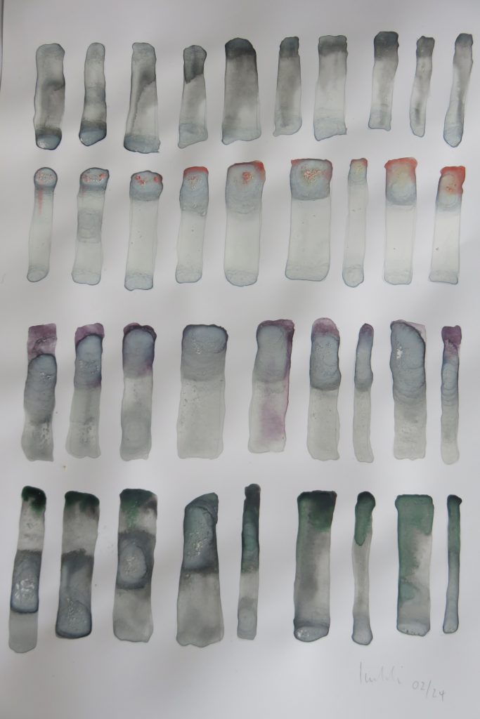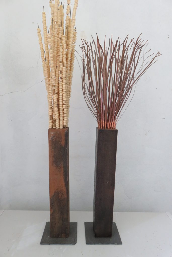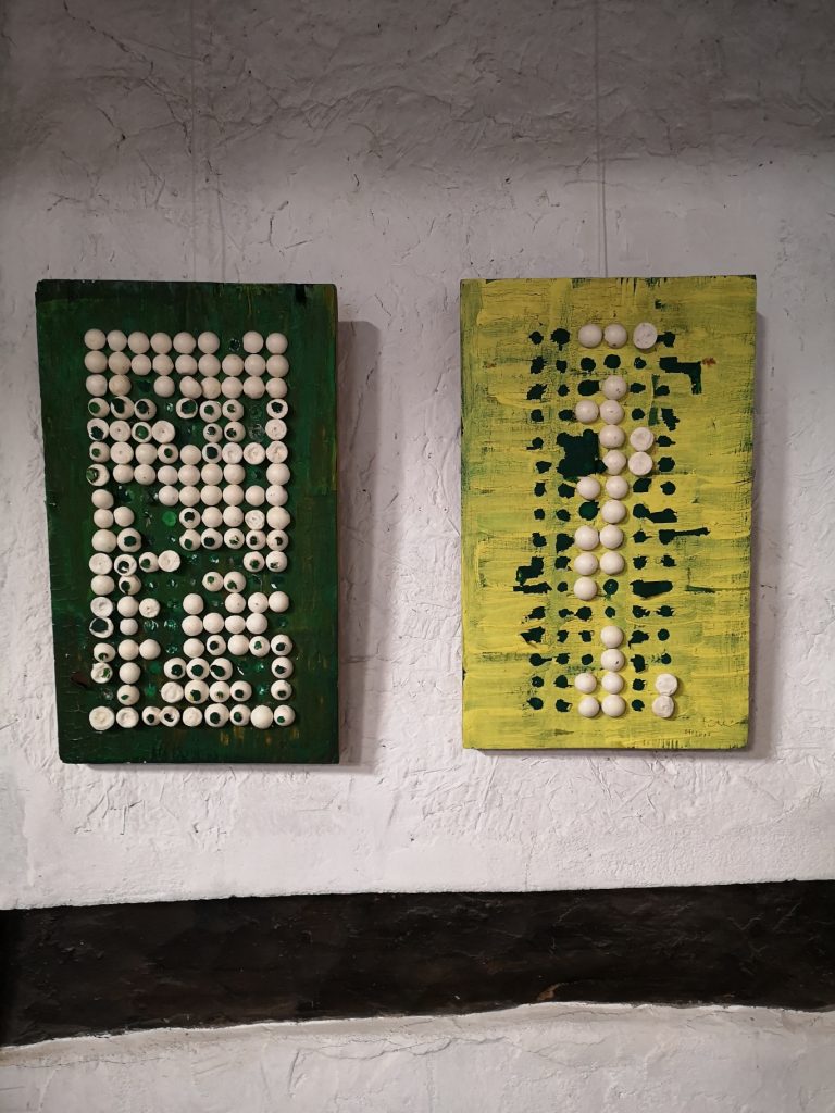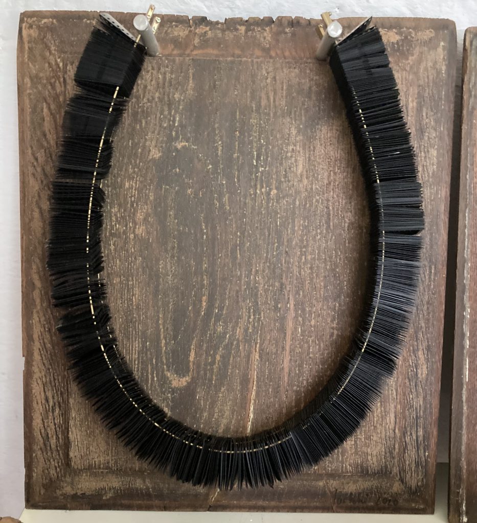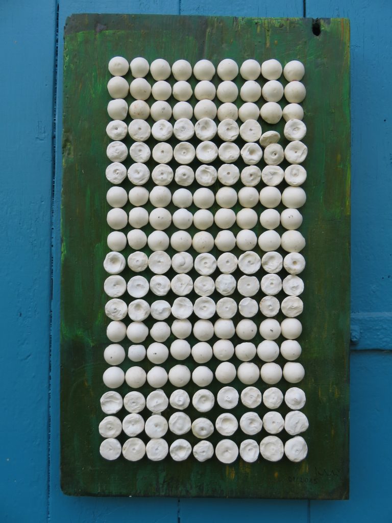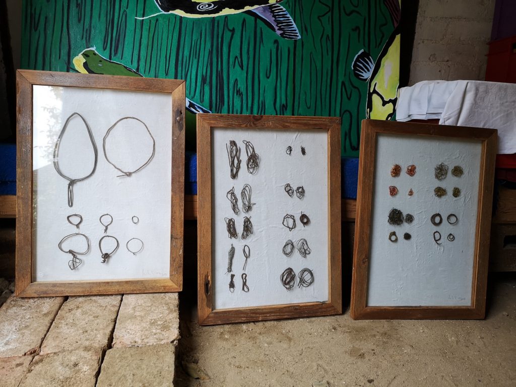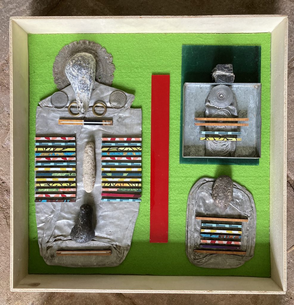 „Baumschnitt 1“ – Obstbaum, Lack„Baumschnitt 2“ – Obstbaum„Baumschnitt 3“ – Obstbaum auf Aluplatte„Diasammlung“ – Dias, Schweißdrahl, Alu auf Eichenbrett„Gurkensalat“ – Filz, Emailletopf„Babe“ – Furnierholz„Steine 1“ – versch. Materialien im Holzkasten„Herrmann Eisenberg“ – versch. Materialien im Holzkasten„Steine 2“ – versch. Materialien im Holzkasten„Koi 4“ – geknüpfte Seide ca. 26×70 cm, 2022geknüpfte Seide ca. 26×26 cm, 2022geknüpfte Seide ca.100×170 cm, 1985geknüpfte Seide ca. 26×26 cm, 2022geknüpfte Seide ca. 26×26 cm, 2022geknüpfte Seide ca. 26×26 cm, 2022„Donnerkeilregen“ – Belemniten, Kupferdraht, Klemmkeile, Eichenbalken„Donnerkeilturm“ – Belemniten„Hornstamm“ – Geweih auf Akazienstamm„Fundturm“ – archäologische Fundstücke, Garn„Kettenkugel“ – 2019 „Zaumzeug“ – Leder auf Eichenbohle, „Skyline“ – Drehbankstähle auf Eichenbohle„Kugelbrett“ – Porzellanmahlkugeln, Lack, Holzbohle„Verbindung“ – Kupfer, Eiche„Knoppfsäule“ – Knöpfe, Schweißdraht, Eiche„“Glasbruch“ – Glas auf Kiefer„Tal der Könige 1“ – versch. Materialien im Holzkasten„Tal der Könige 2“ – versch. Materialien im Holzkasten„Tal der Könige 3“ – Tierschädel, Seide im Holzkasten„Flechtwerk 1“ – Papier auf Buchenbohle„Flechtwerk 2“ – Papier auf Buchenbohle„Hülle 1“ – Seidenpapier, Peddigrohr auf Eichenbohle (3-teilig)„Hülle 2“ – Seidenpapier, Peddigrohr auf Buchenbohle„Wicklung“ – Kupfer auf Eichenbohle„Wollbesen“ – Wolle, Schneebesen auf Eichenbohle„Stahldruck“ – Stahldruckproben auf Eichenbohle„Flucht“ – Schädel, Bleischiffchen„Seeufer“ – Muscheln, Sackleinen, Holzstäbe„Schnittwerk 1“ – Messing, Eiche„Skyline“ – Messing, Eichenbalken„Cornetto“ – Gips, Alu, Wurzelholz auf Eichenplatte„Waldgang“ – Tierschädel, Lack, Filz im Holzkasten„Strein im Kasten“ – Stein, Silberdraht, Eichenbrett, Filz, Holzkasten„hängender Stein“ – Feuersteinknolle im Eichenbalken, 2019„Farbspiel“ – Mosaikkunststoff auf Buchenbohle (6-teilig)„geschlossene Kirche“„Hammerdenkmal“„Drahtfund“ „Glasbruch“ – Glas auf Eichenbohle„Steinseide“ – Seide, Sandstein„Seidenstück“„Steinseide grün und gelb“ – Seide, Sandstein„Macchia“„Autowerkstatt“ – Lochkarten, Kupferdraht, Stahlrahmen„Hühnerstein“ – Lochsteine auf Eichenbohle„Zwiegespräch“ 2023 – Zahnprothesen, Pappmache, Lack`“Zündholz“ – Holz, Lack auf Alublech„Fische“ 2022 – ca. 26×26 cm geknüpfte Seide